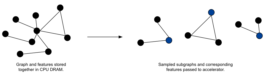 An immediate observation of GNNs is that scaling to data larger than the available memory of a chosen accelerator requires training on sampled subgraphs (which form mini-batches), instead of the full graph at once (full-batch training). While this method adds stochasticity to the learning process, it reduces the memory requirements of the accelerator to those of the sampled subgraphs.
