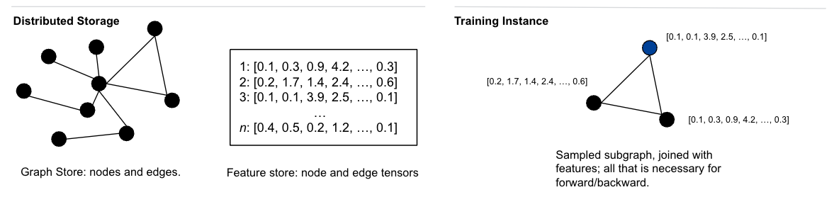 In PyG 2.2 and beyond, the separation of graph data into its features and structure information, the storage of this information in locations potentially remote to the actual training node, and the interactions between these components, are all completely abstracted from the end user.