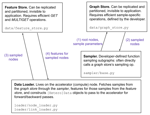 Figure 3: The common interfaces (and data flow) uniting the :class:~torch_geometric.data.`FeatureStore`, GraphStore